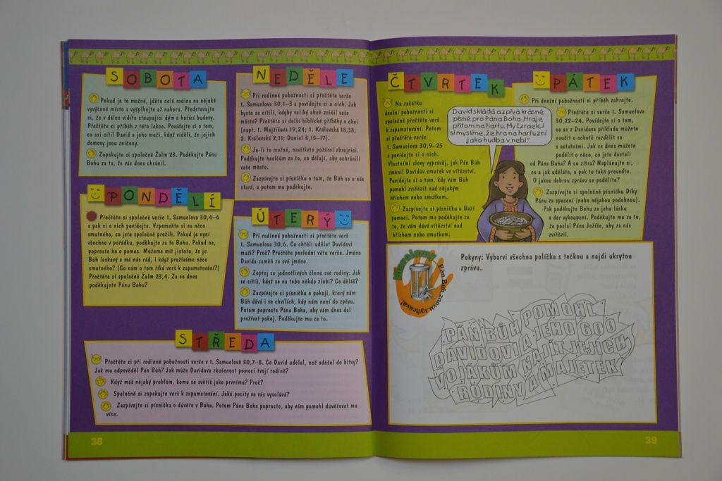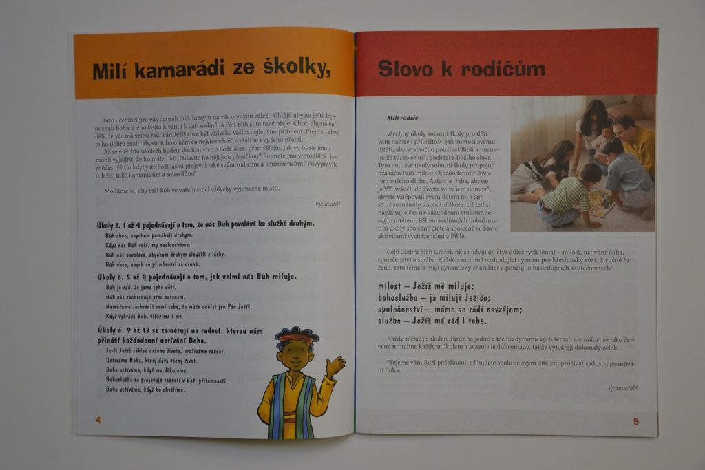 Přesto budou děti potřebovat také a především Vás, abyste jim pomohli vnést poselství o Boží lásce a milosti do života rodiny a dobře upevnit to, co se učí v sobotní školce. Promyslete si, kdy si vyhradíte čas na každodenní studium se svým dítětem. Během společných pobožností si spolu čtěte biblický příběh a úkol a také se zapojte do aktivit, které mají upevnit biblické poselství v dětském myšlení a cítění.